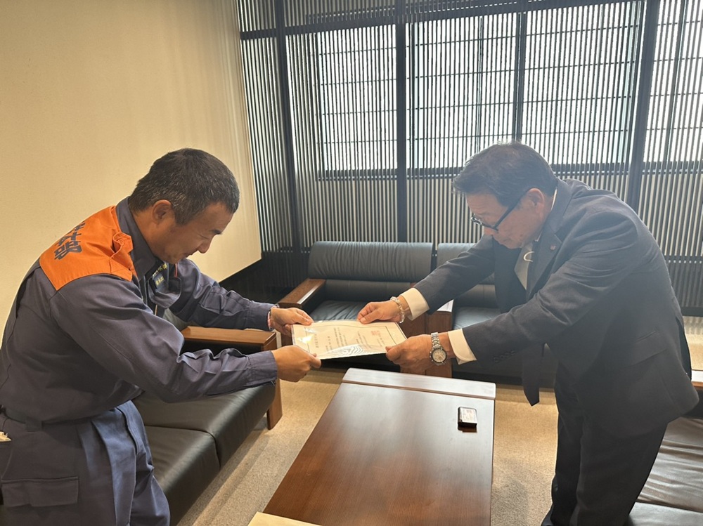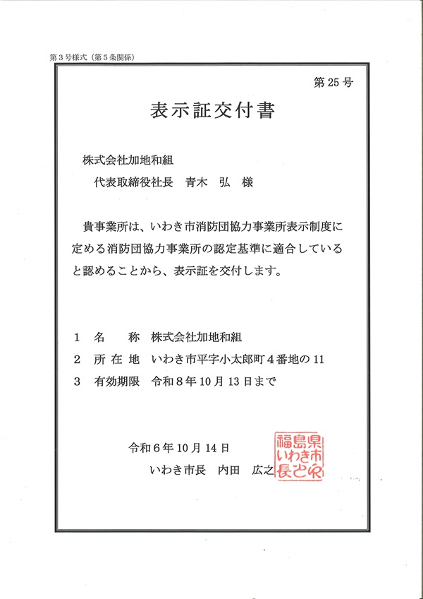 令和6年10月、当社はいわき市消防団協力事業所の表示証をいわき市消防団第一支団長様より交付されました。